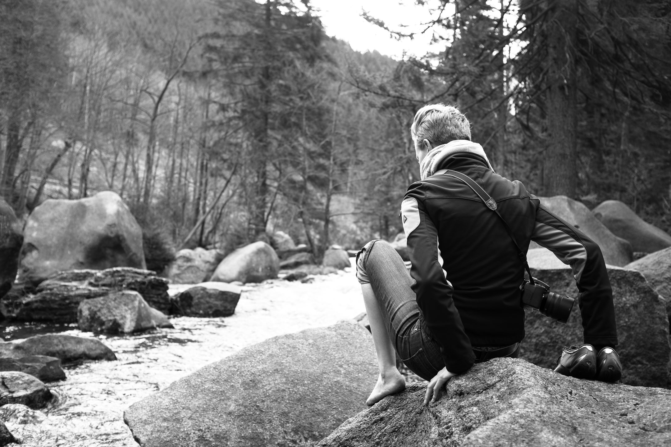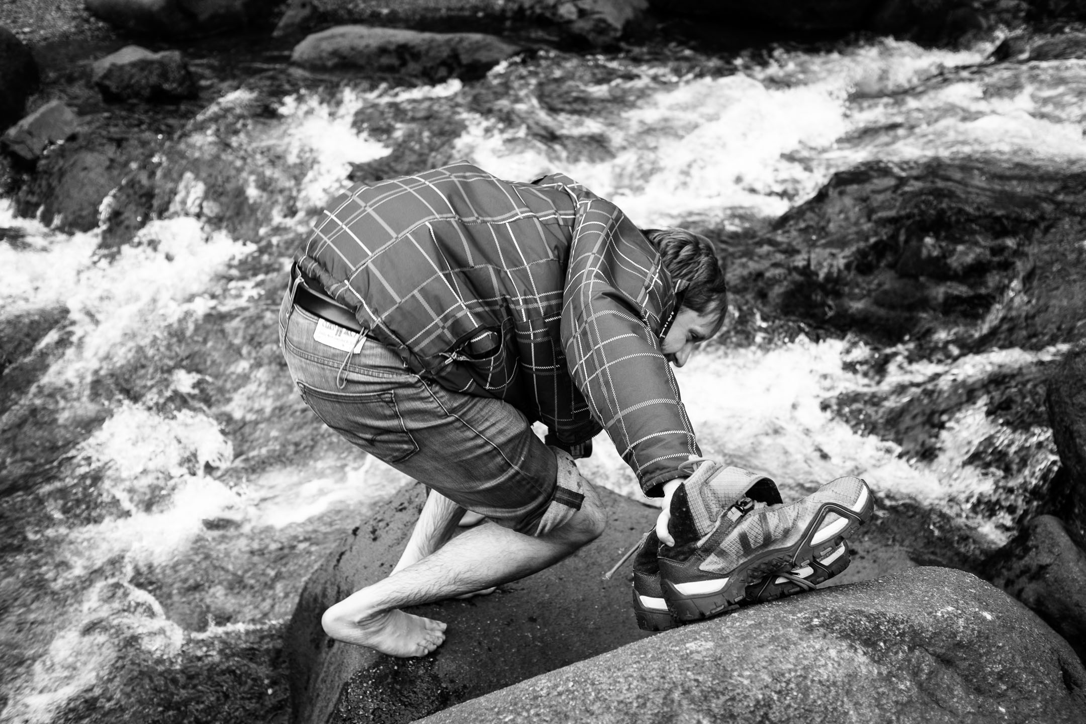 Die etwas träge Gruppendynamik führte dann aber dazu, dass es Sekunden später zu spät war. Das Wasser war beträchtlich gestiegen und machte das trockene Überqueren in beide Richtungen unmöglich. Nachdem die Lage ausgiebig begutachtet und fotografiert wurde, entschieden wir uns für den barfüßigen Rückweg über ein paar mittlerweile kräftig überspülte Steine.