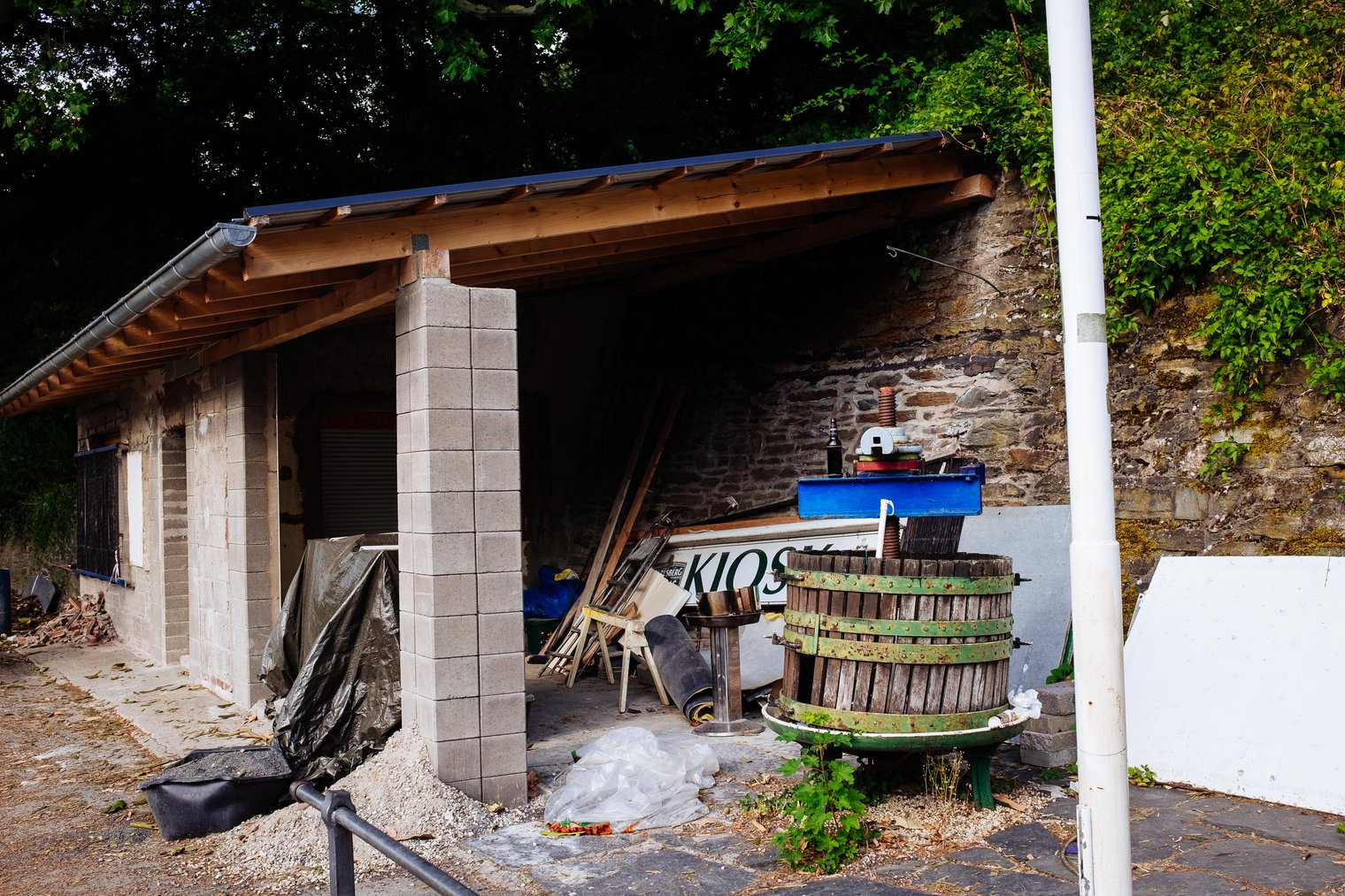 The next day started with the first Rhine crossing by ferry. In this area, there aren’t many bridges so cars and pedestrians have to take small local ferries to get across. On the other side, we rode up to an interesting looking church that we had seen from the other side. Interestingly, it had an outdoor altar and benches that looked like it was straight out of Tamriel.