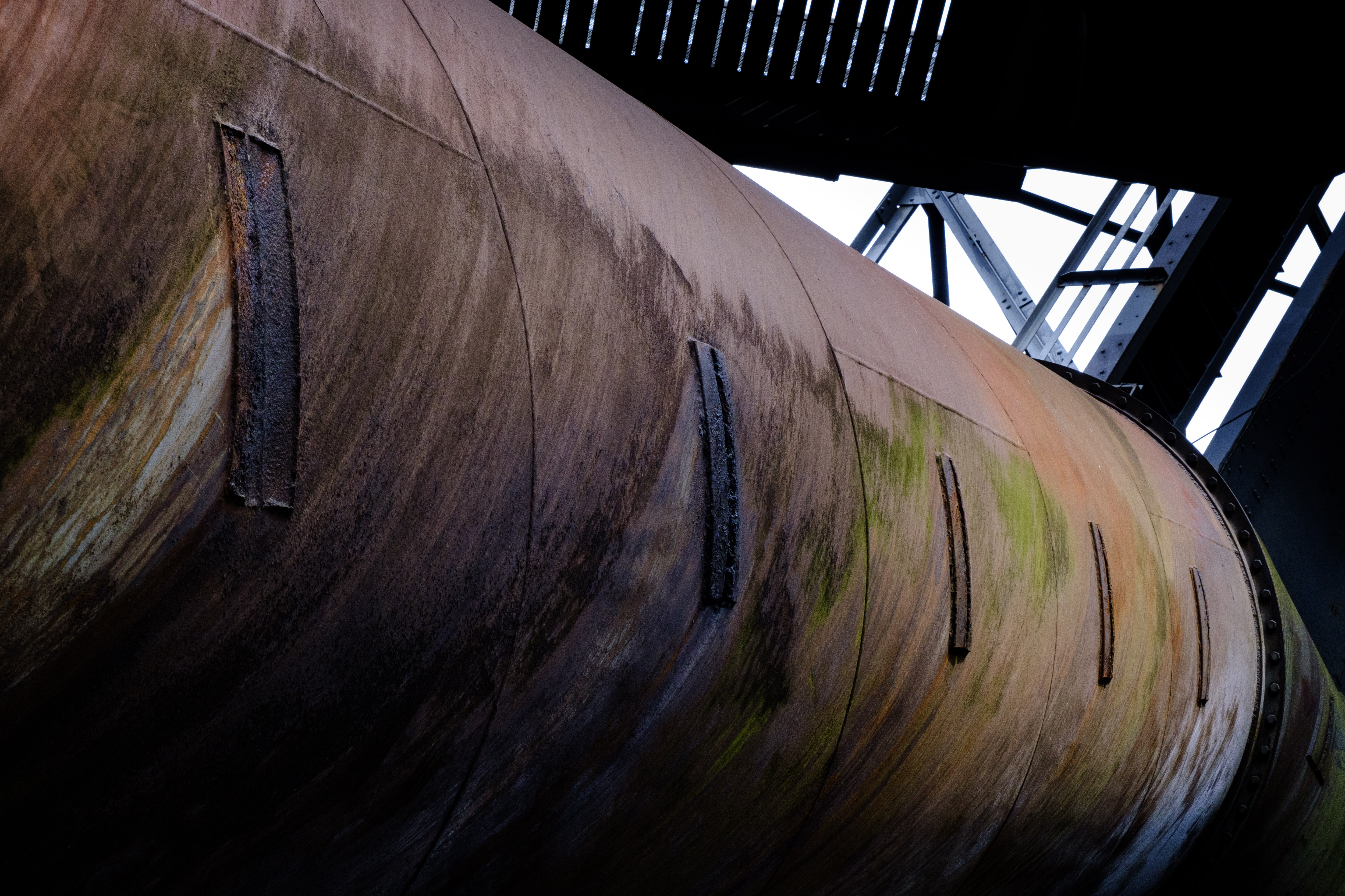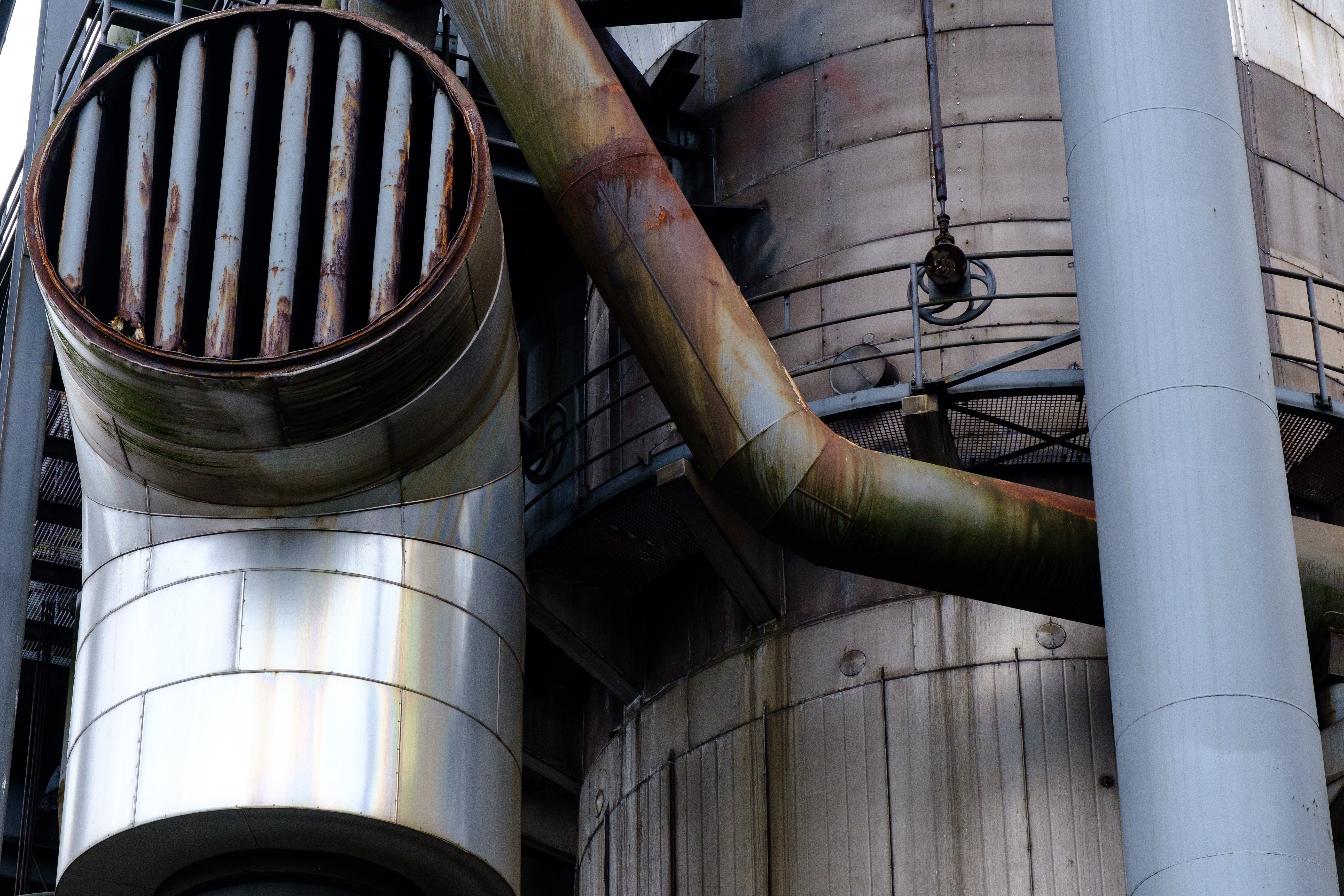 Then, I climbed up the furnace on the outside, using externally mounted stairs and walkways past the rusty metal…