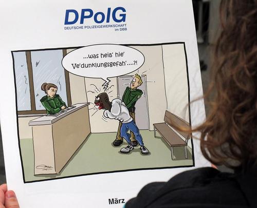 Konkret geht es zum Beispiel um eine Karikatur mit einem festgenommenen Farbigen mit überzeichneten dicken roten Lippen, der sich gegen den Griff eines Polizeibeamten wehrt und in gebrochenem Deutsch schreit: „Was heiß’ hie’ Ve’dunklungsgefah’....?!“ Auf einem anderen Bild prügeln sich junge Männer, die ausnahmslos Migranten zu sein scheinen. Einer von ihnen sagt: „Boah... krass... 3ern BMW...!“ Das Januar-Bild zeigt die Heiligen Drei Könige und der schwarze König muss Kamel-Exkremente aufsammeln. In der August-Karikatur geht es um einen Selbstmörder und einen Polizisten, der ihm sagt: „Jetzt spring’ endlich, du Idiot, ich hab noch anderes zu tun heut!“